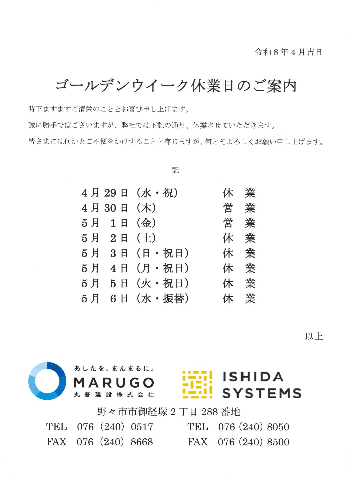 GW休業のお知らせ